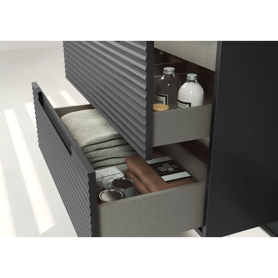 Deze badkamermeubelset is gemaakt van hoogwaardige materialen die garant staan voor een lange levensduur. Het MDF-meubel is stevig en bestand tegen de vochtige omstandigheden in de badkamer, terwijl de keramische wasbak krasbestendig en eenvoudig schoon te maken is. De mat antraciete afwerking behoudt zijn uitstraling ook na jarenlang gebruik. Bovendien zijn de lades voorzien van softclose-mechanismen, waardoor ze geruisloos en soepel sluiten. Zo investeer je in een meubel dat niet alleen mooi is, maar ook betrouwbaar en duurzaam in gebruik.