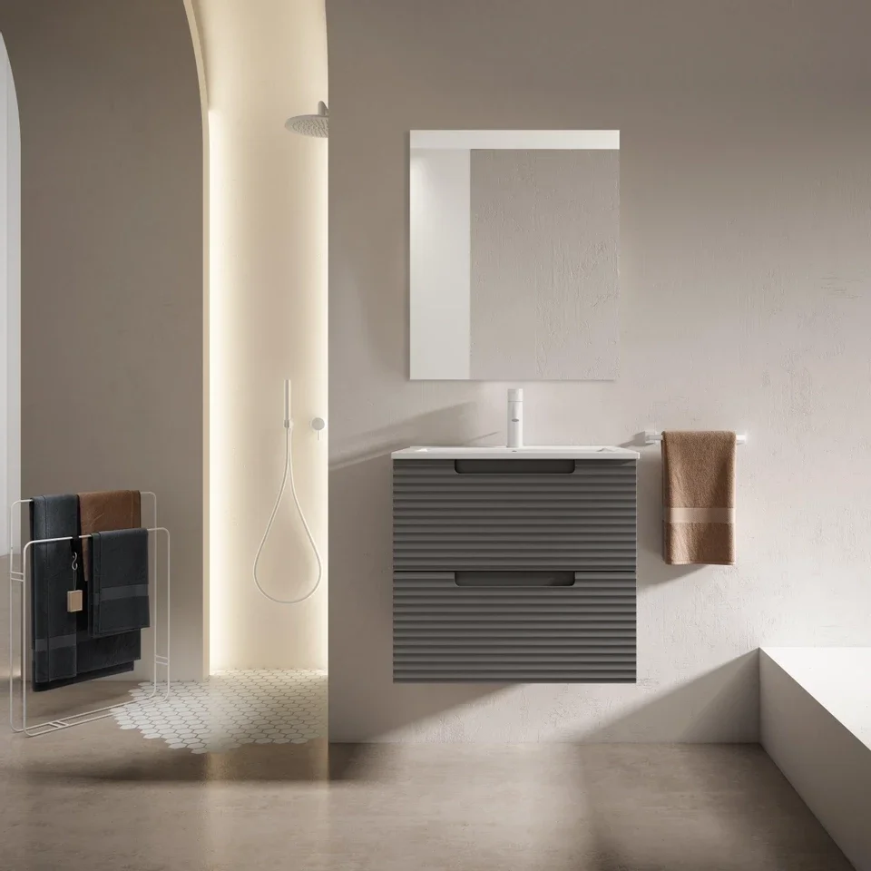 Deze set valt direct op door zijn moderne en minimalistische design. De matte kleuren geeft het meubel een elegante en rustige uitstraling, die perfect aansluit bij hedendaagse badkamertrends. De strakke lijnen en rechthoekige vormen versterken het gevoel van ruimte en orde, waardoor jouw badkamer er direct verzorgd en uitnodigend uitziet. Door de combinatie van de keramische wasbak in helder wit met het antraciete meubel creëer je een mooi contrast dat zowel fris als warm oogt. Zo geniet je van een badkamer die niet alleen functioneel is, maar ook een lust voor het oog.